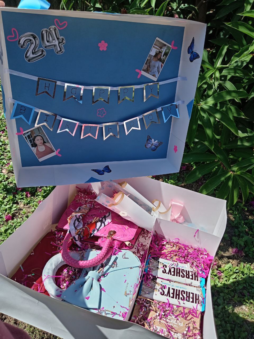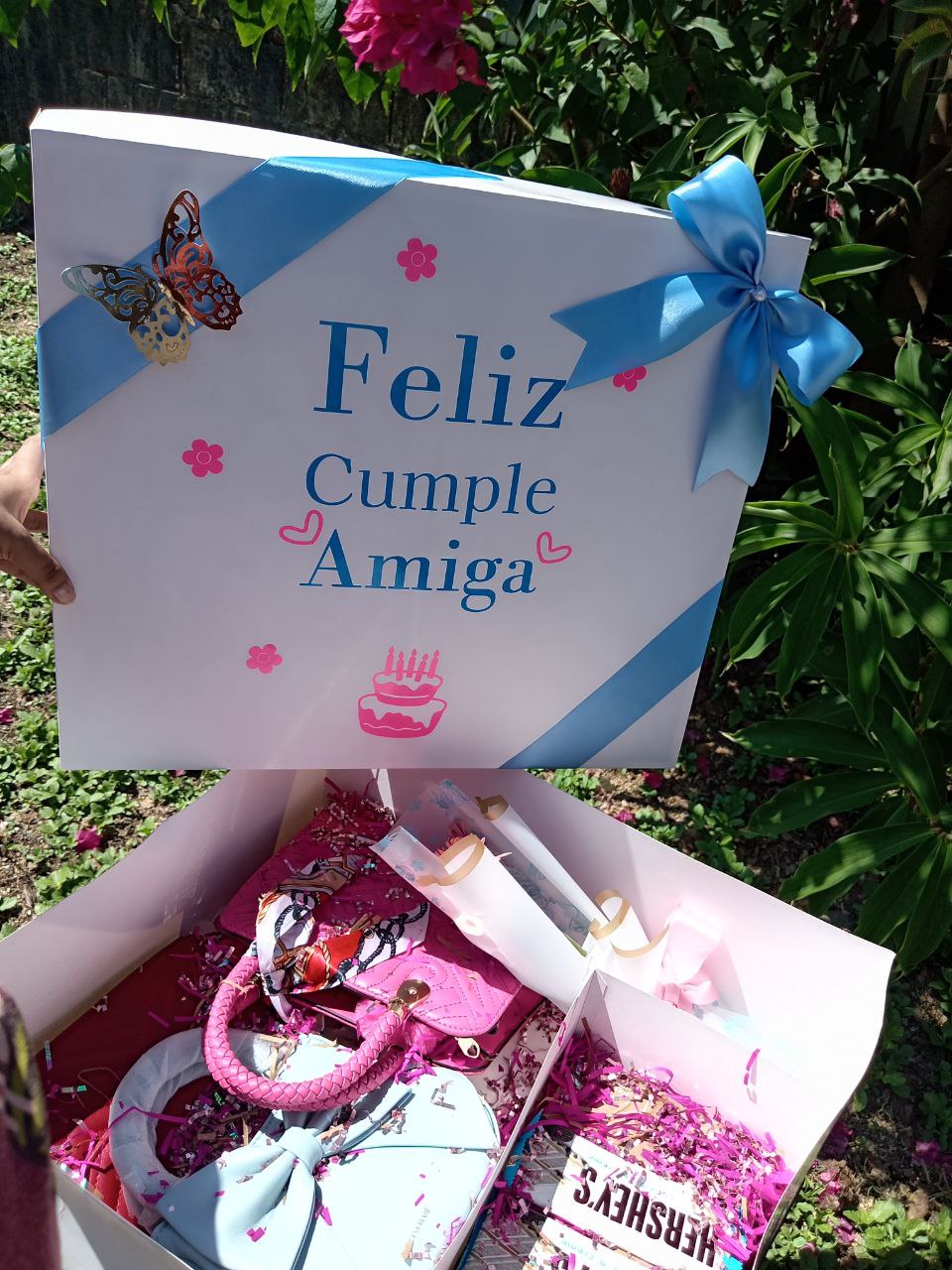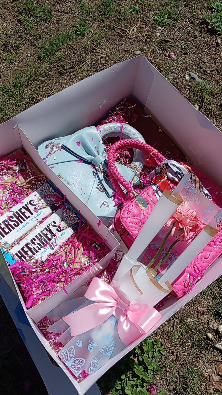Maxi caja con regalos sorpresa , contiene 3 carteras , 1 Termo Stanley grande.