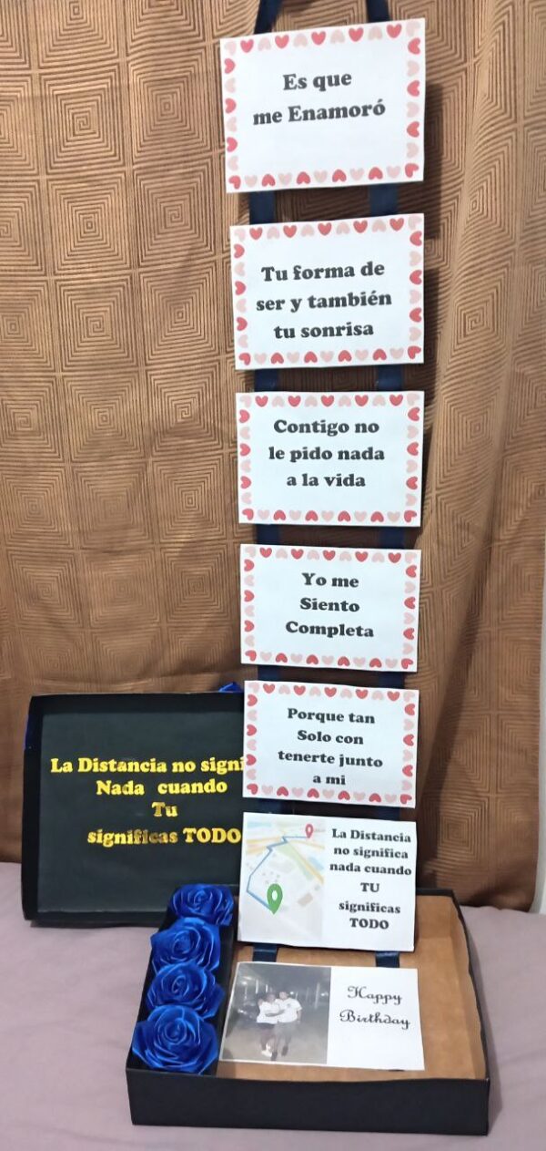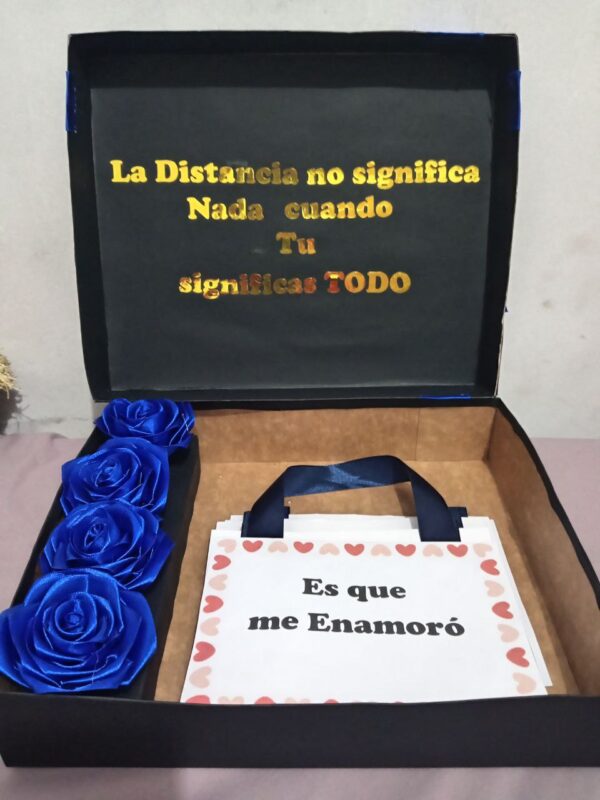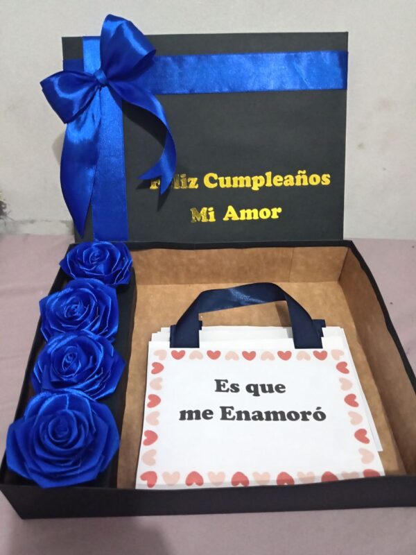 Caja de regalo con 5 rosas Eternas , 1 acordeón de Mensaje , con Stiker en Vinil para Decorar la caja por dentro y Fuera.